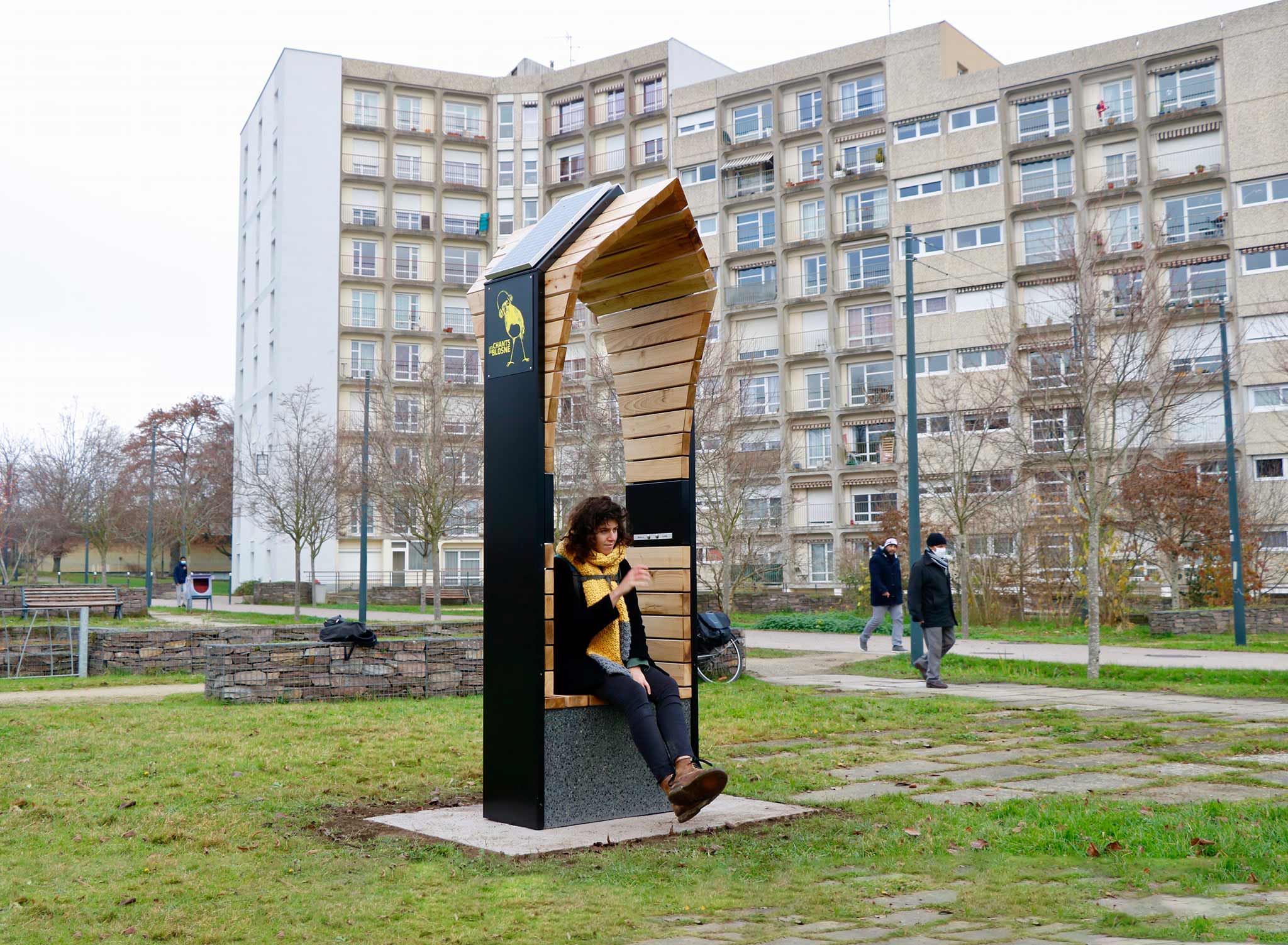 Equipée de panneaux solaires, chaque borne propose 2 portraits sonores d’habitants du quartier (d’une durée moyenne de 5 mn), à écouter seul ou à deux.