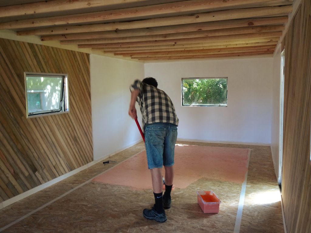 C'est le métisse, ce matériau issu du cycle de valorisation de fibres textiles auquel Emmaüs et Le Relais prennent part qui aura permis d'isoler le mobile home. Le parement des murs aura été réalisé à 80% avec un stock de lames de lambris trouvées dans les réserves et restaurées par un lessivage à la soude. La construction d'une nouvelle toiture a aussi été décidée afin d'assurer l'étanchéité de la structure, de diminuer encore la perte de chaleur, d'anticiper la captation des eau pluviales tout en gagnant encore un peu de volume à l'intérieur.